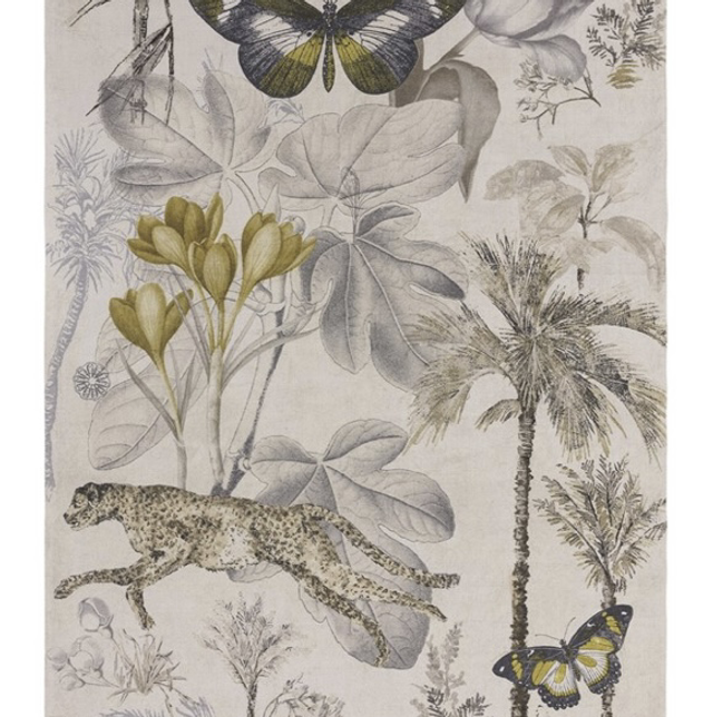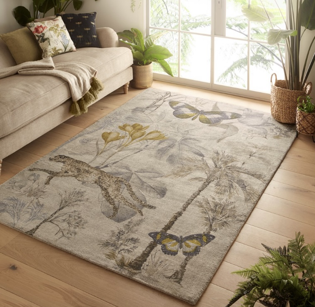 The Botany rug by Clarke & Clarke will bring style and comfort to your floor, working beautifully with any modern interior. Displaying palm trees and leaves interspersed with oversized butterflies and wild cats, telling a botanical story in its pattern. This bohemian rug will bring a layer of exotic island life to your space, perfect for living room, hallway or bedroom areas. Handloomed and digitally printed using recycled fibres on 84% PET 12% cotton 3% viscose 1% acrylic base, meaning this rug is friendlier to our environment whilst still maintaining the softness of wool. Available in a range of sizes from small to large.