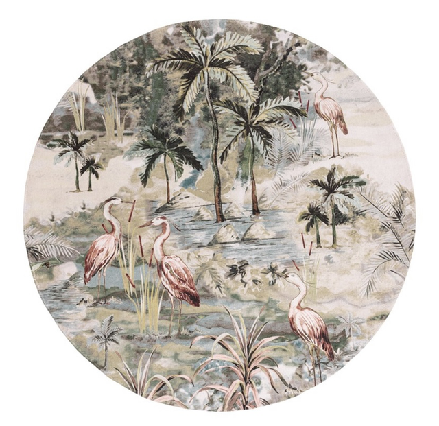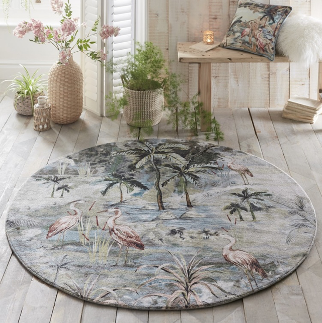 The Habitat circle rug by Clarke & Clarke will bring style and comfort to your floor, working beautifully with any modern interior. Displaying elegant flamingo motifs and muted palm trees on a tonal tropic backdrop. This Habitat rug will bring a tropical feel to your space, perfect for living room, hallway or bedroom areas. Handloomed and digitally printed using recycled fibres on 84% PET 12% cotton 3% viscose 1% acrylic base, meaning this rug is friendlier to our environment whilst still maintaining the softness of wool.