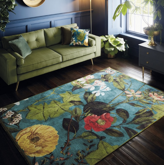 Elevate your interior with the Passiflora rug by Clarke & Clarke. Featuring hypnotic passionflowers and exotic botanicals, against a rich kingfisher blue background. This dazzling rug will bring a layer of luxury, glamour, and style to your space, perfect for a living room, hallway or bedroom with a shabby chic or farmhouse vibe. Machine woven with 100% polyester making this rug durable, stain resistant and comfortable beneath the feet. Available in a range of sizes from small to large.